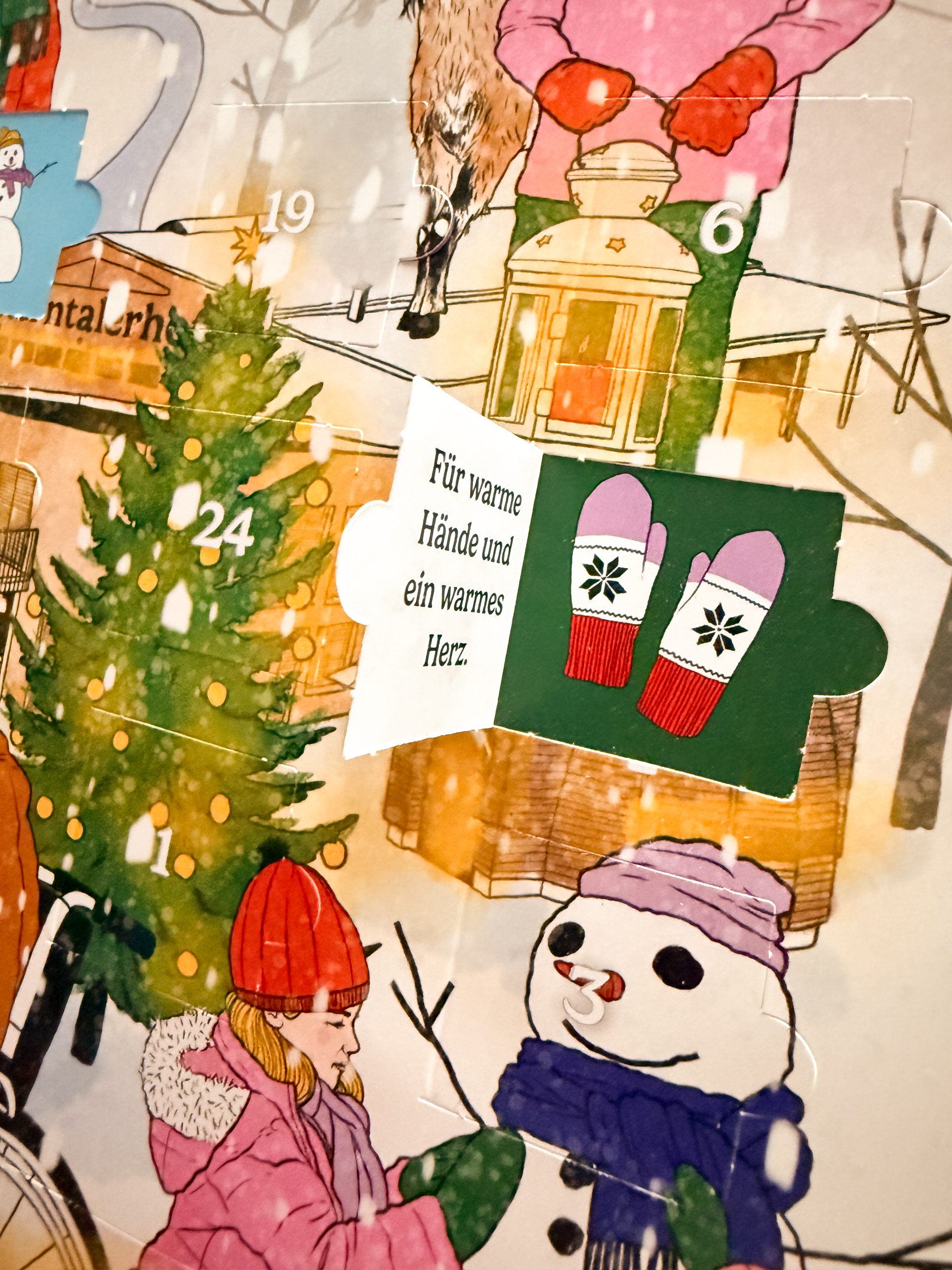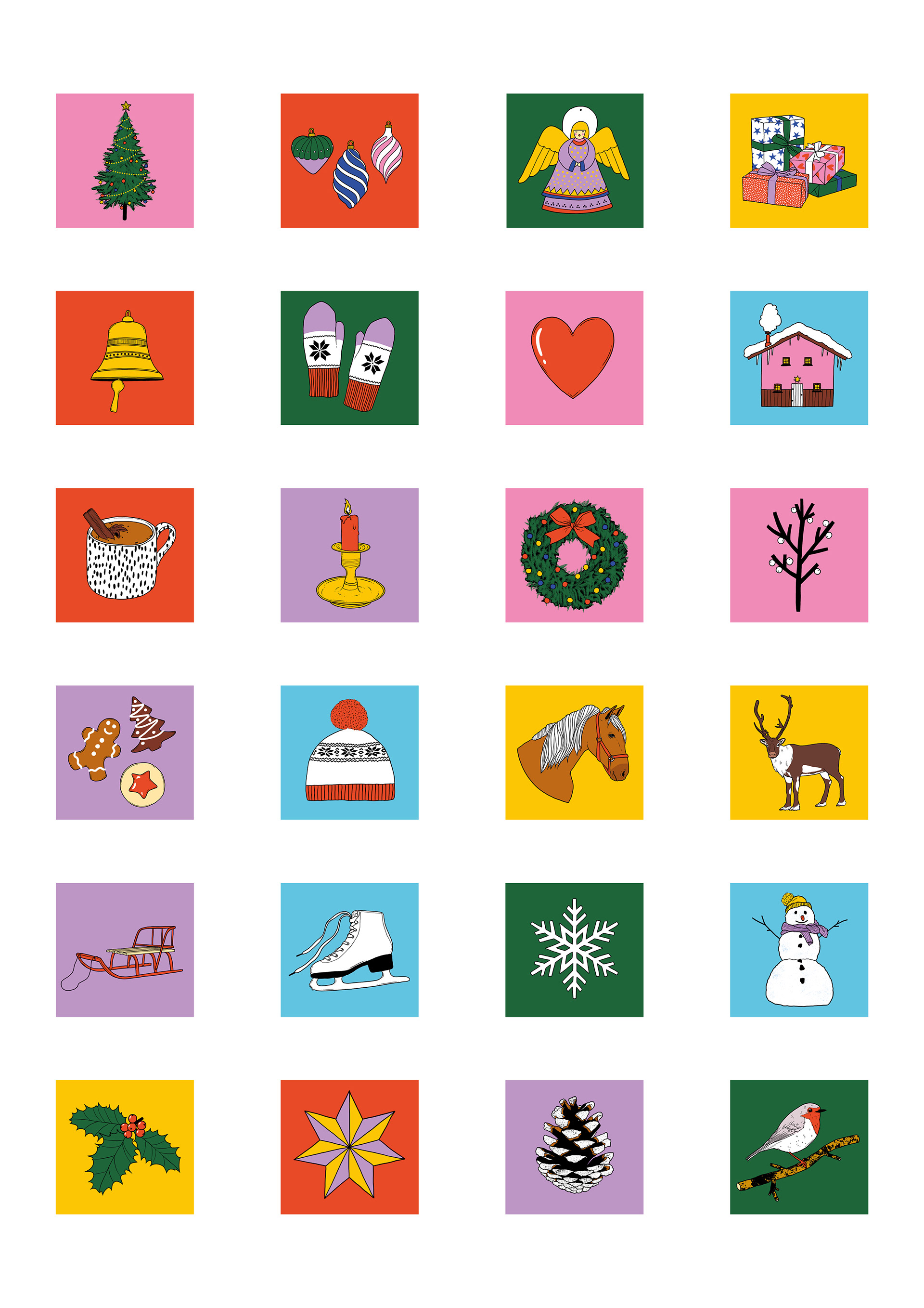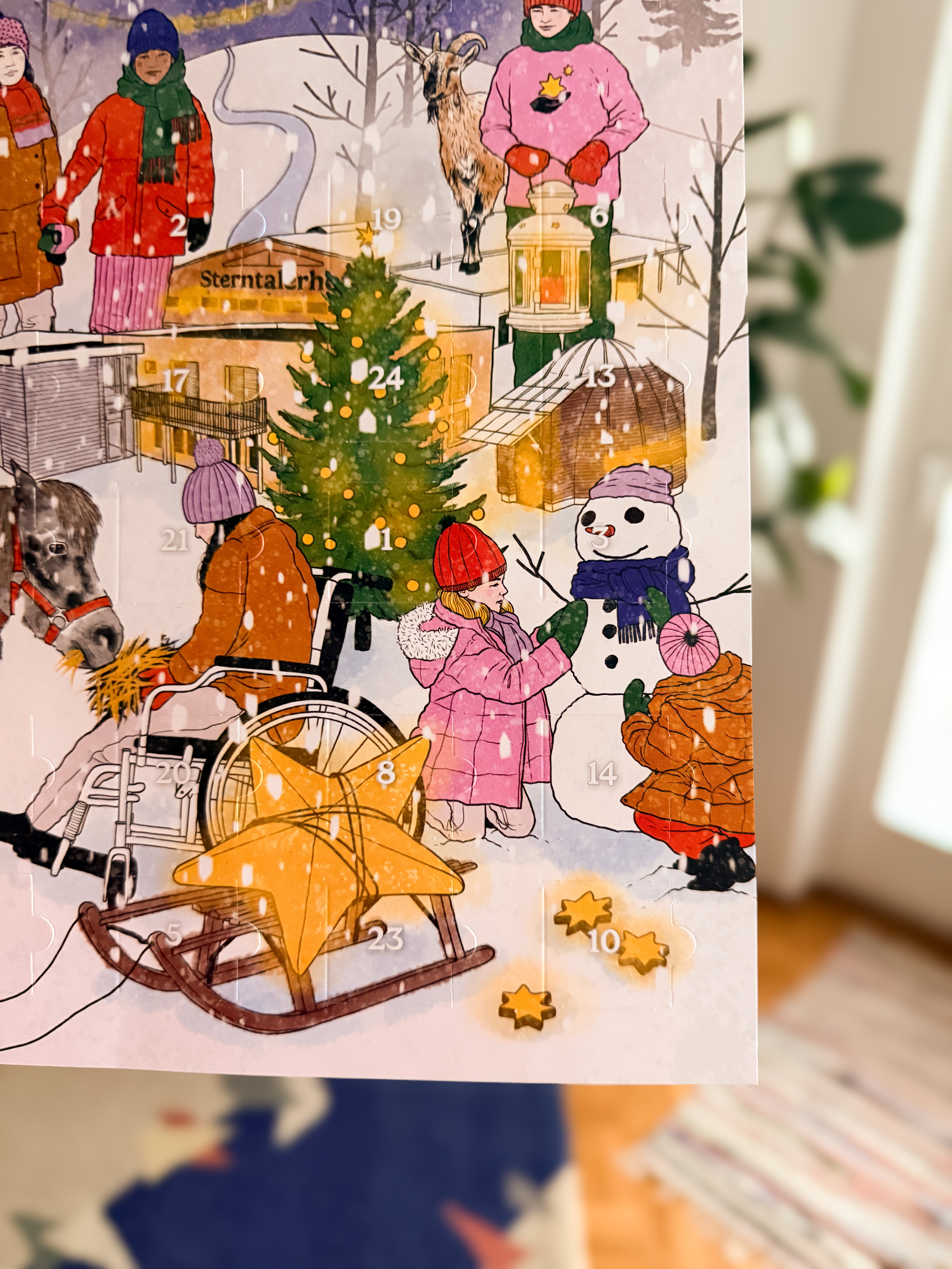 Adventkalender für den Sterntalerhof . Illustration der Vorderseite (DIN A4) und 24 kleine Illustrationen für die Innenseite der Türchen.