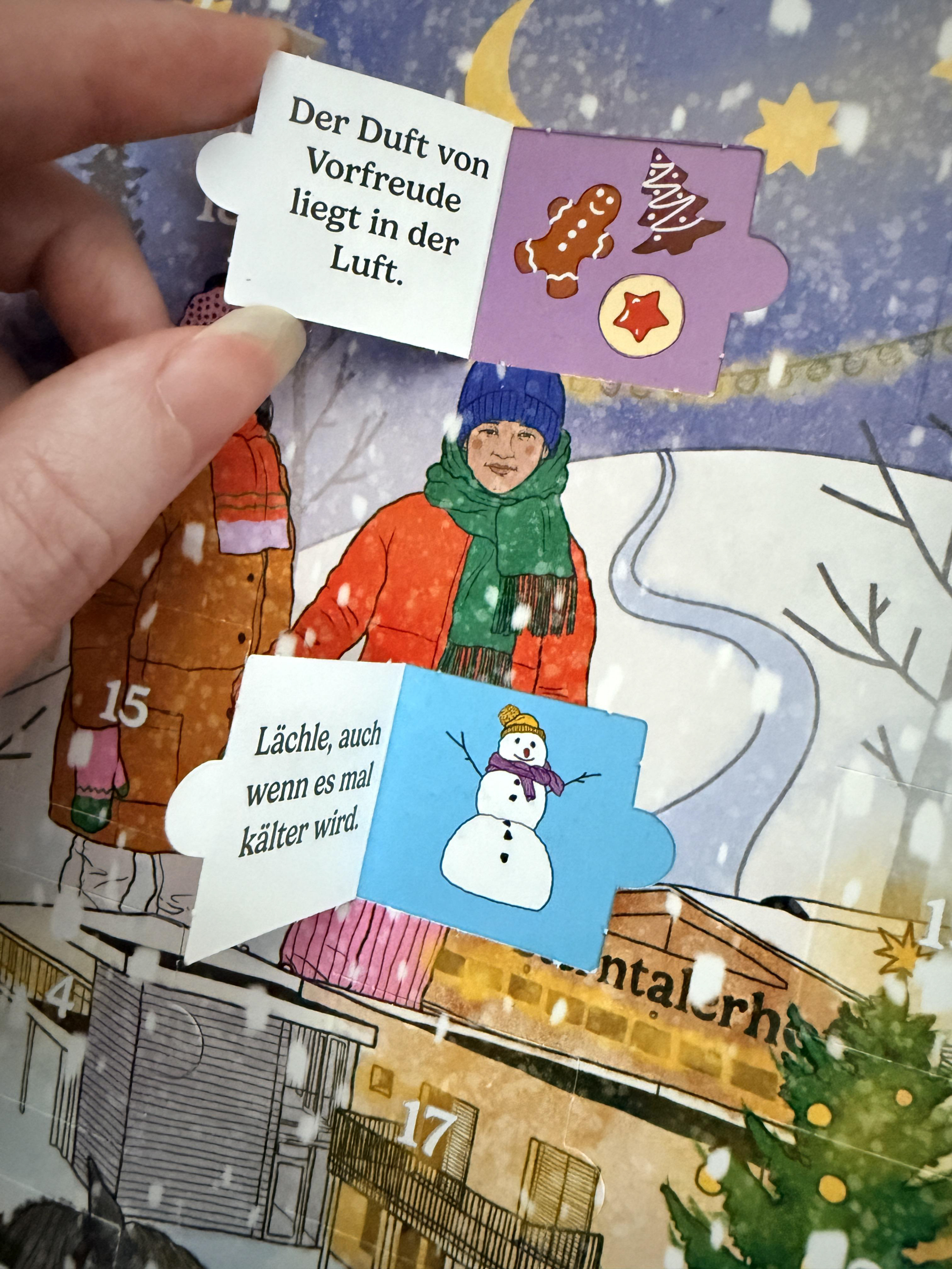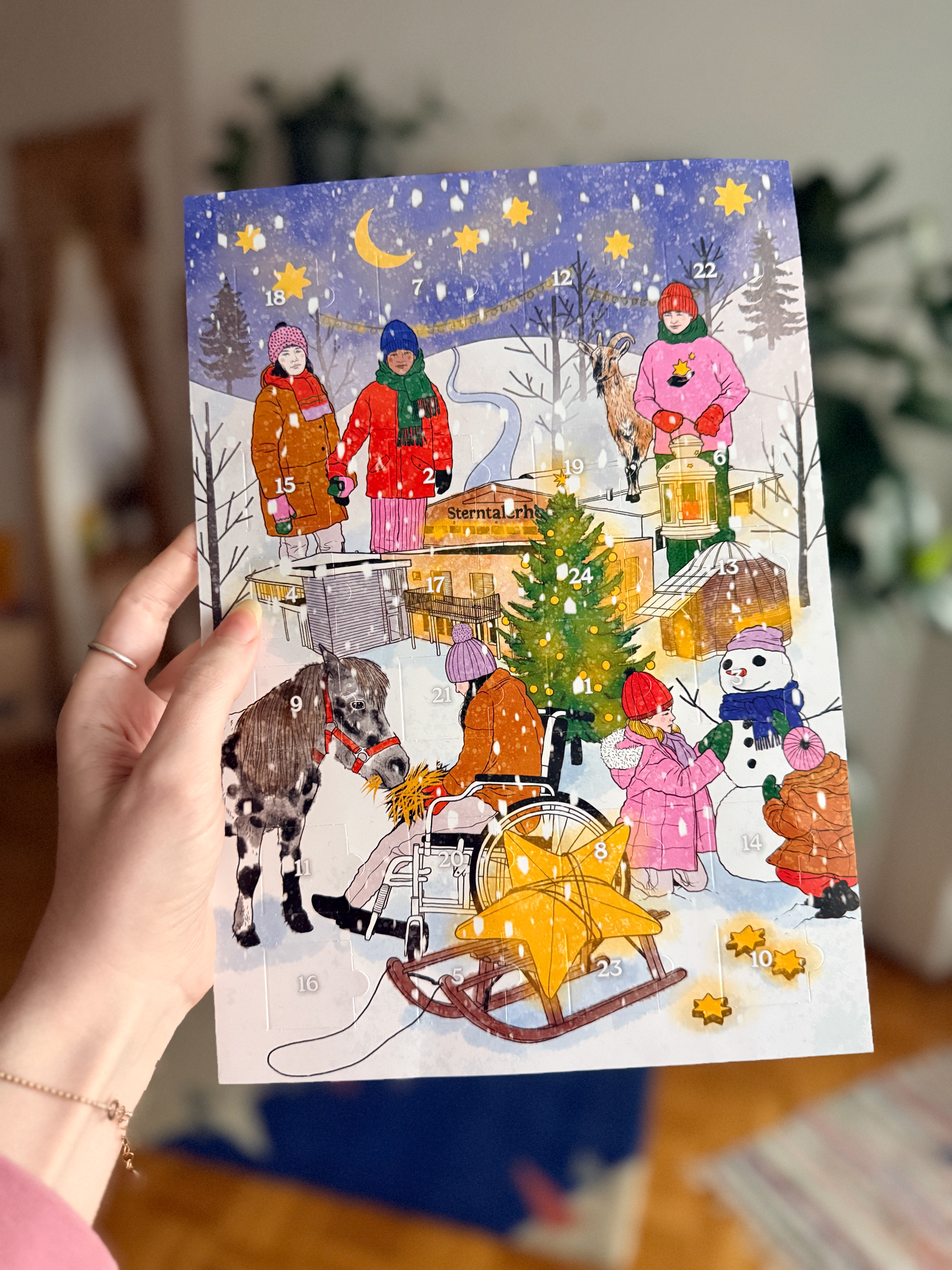 Adventkalender für den Sterntalerhof. Illustration der Vorderseite (DIN A4) und 24 kleine Illustrationen für die Innenseite der Türchen.