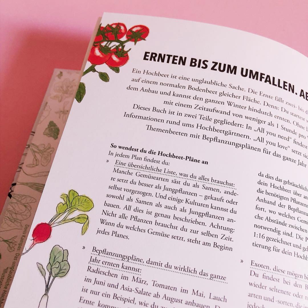 "Das unglaubliche Hochbeet. Ernten bis zum Umfallen", Doris Kampas, erschienen im Löwenzahn Verlag 120 Seiten, Hardcover, inkl. Anbau- und Erntekalender-Poster Konzept & Art Direction: Löwenzahn Verlag/Anita Winkler, Katharina Schaller Illustrationen, Umschlag-/Buchgestaltung & grafische Umsetzung: Ruth Veres