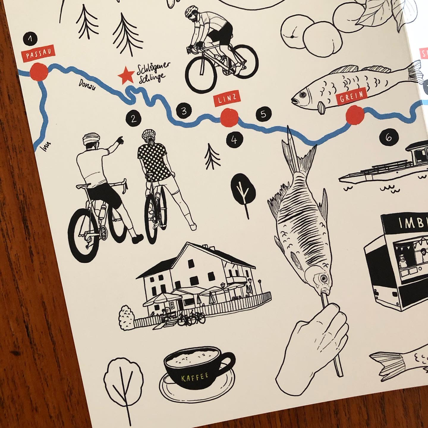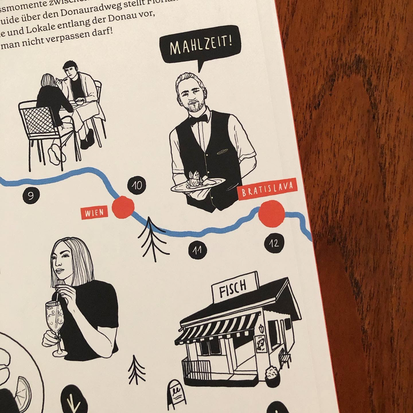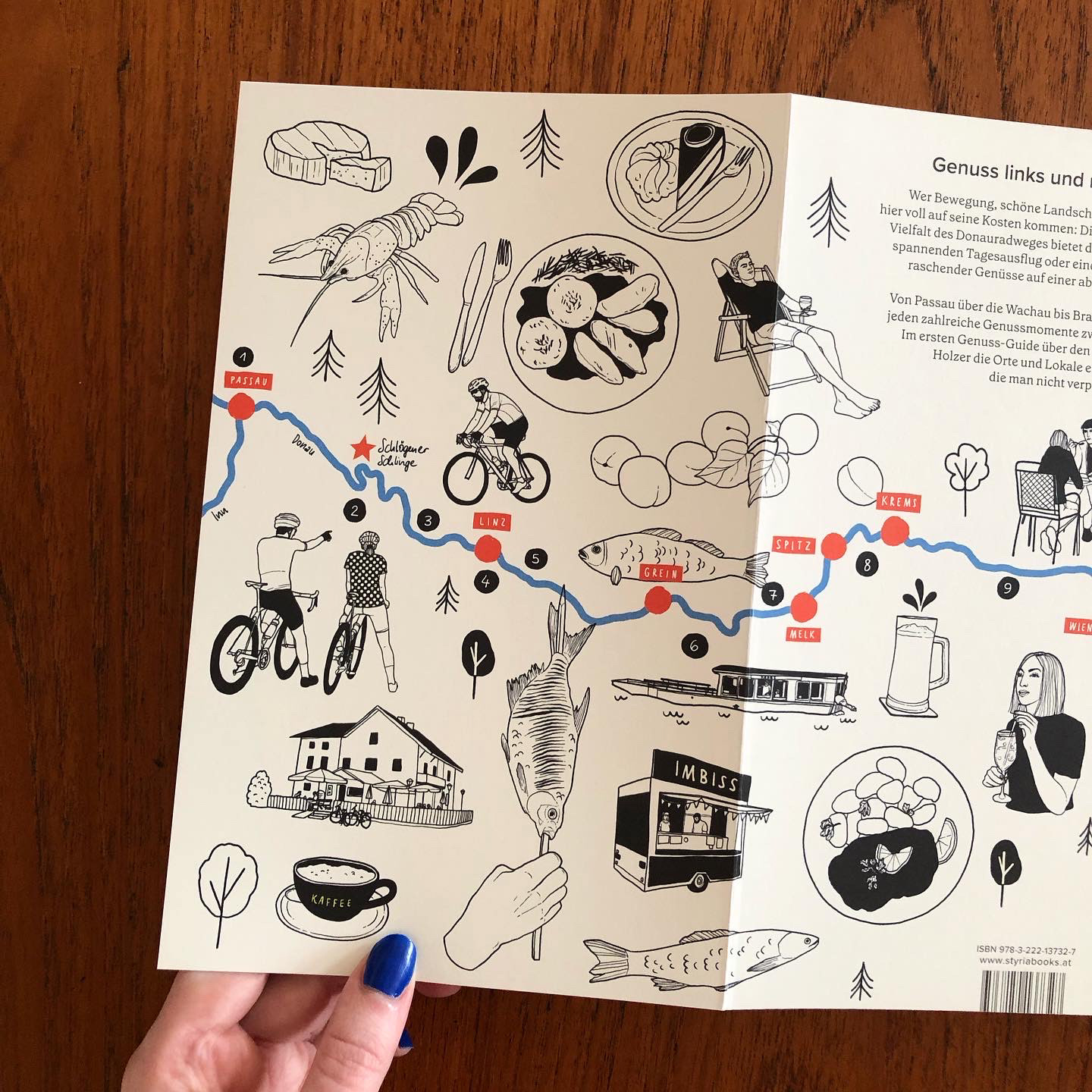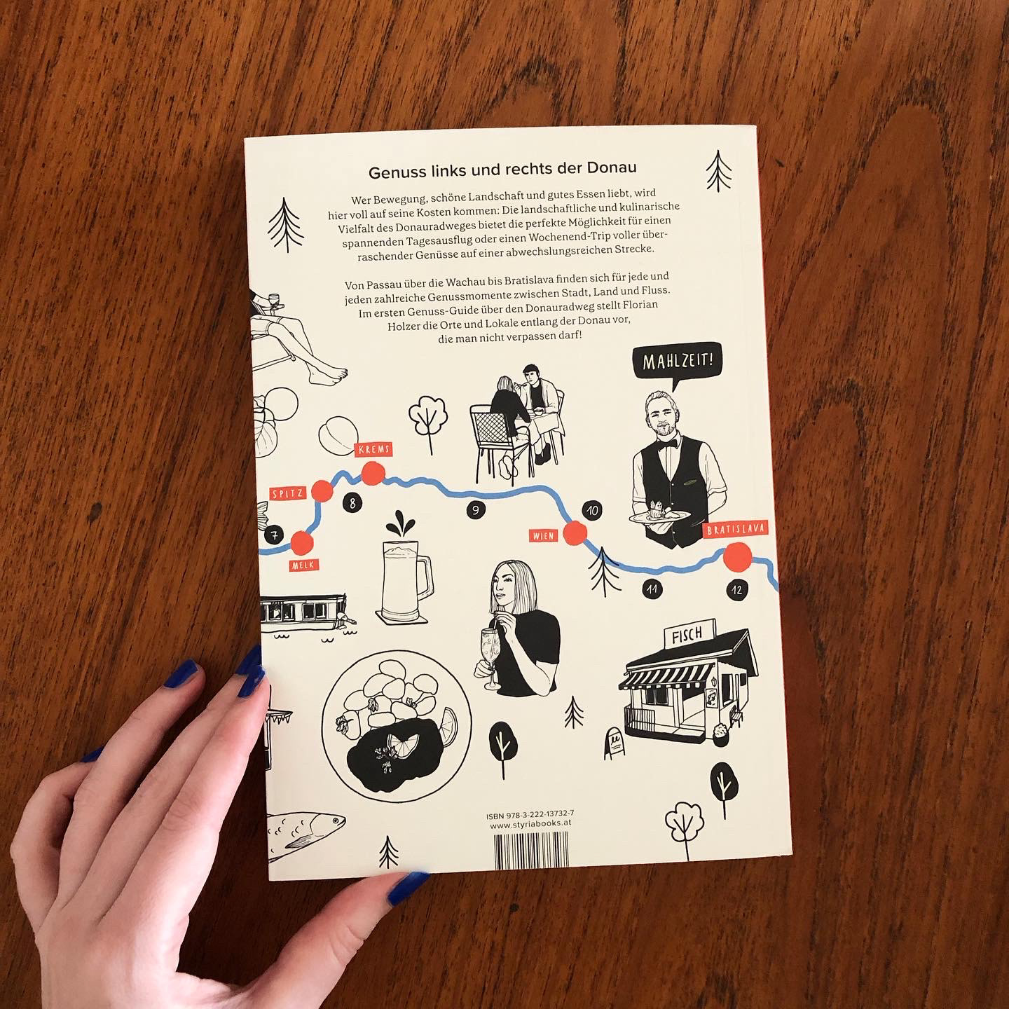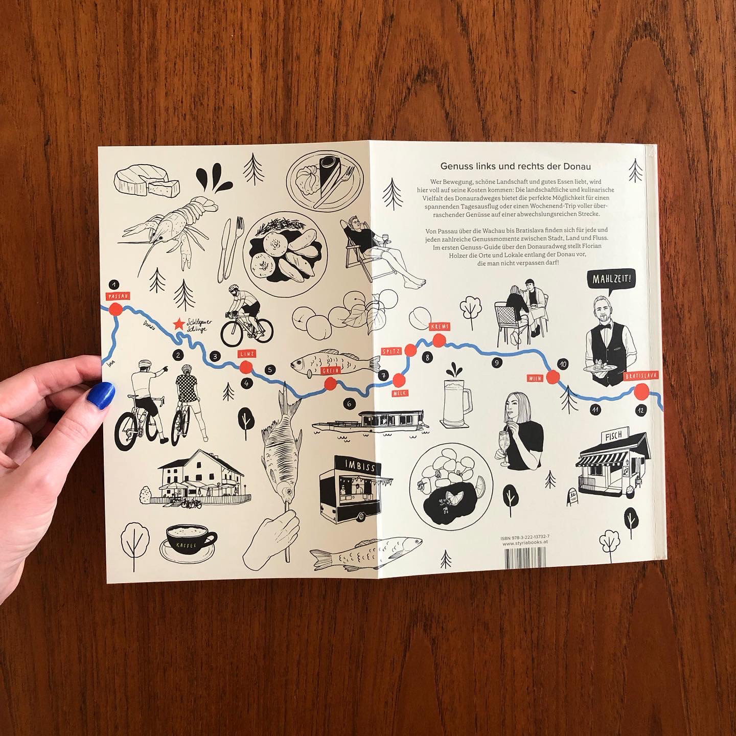 "Der Donauradweg für Genießer. 150 Restaurants, Lokale und Gasthöfe zwischen Passau, Wien und Bratislava", Florian Holzer, erschienen im Styria Verlag. Fotografie: Rupert Pessl; Buch- und Covergestaltung: Jefferson & Högerle; Coverillustration: Ruth Veres; Projektleitung: Sophie Wolf